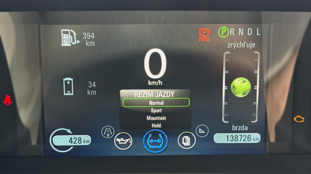Mountain mód zasa vytvorí rezervu batérie približne na úrovni 45 až 50 percent, aby mal systém pri prudkom stúpaní alebo diaľničnej záťaži dostatok elektrického bufferu. V praxi sa ukazuje, že pri dlhších trasách vie správne použitie Hold alebo Mountain režimu naozaj výrazne zlepšiť efektivitu spaľovacieho motora.