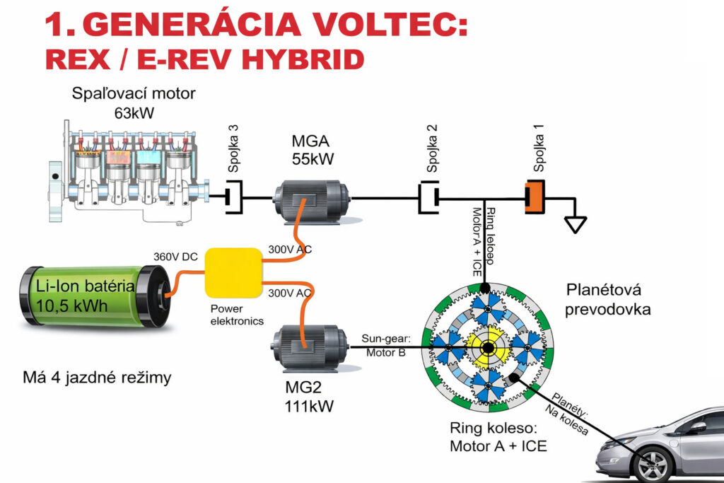 Mnoho ľudí má dodnes pocit, že Ampera má len elektromotor a k nemu prilepený generátor. Realita je však oveľa zaujímavejšia. Srdcom systému je planétová prevodovka s viacerými spojkami, ktorá prepája spaľovací motor, oba elektromotory a výstup na predné kolesá. Nie je to klasická prevodovka v zmysle radenia stupňov, ale inteligentná mechanická sústava, ktorá umožňuje rôzne režimy práce.