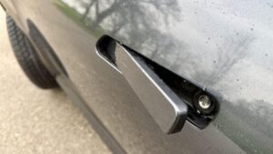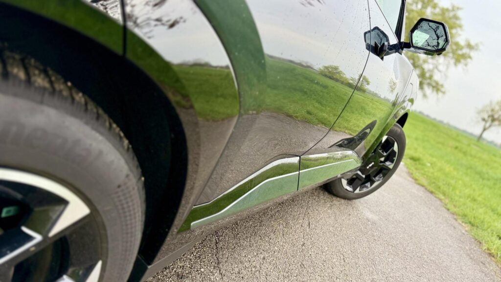 Verzia GT-Line si pomáha aj vizuálnymi detailmi, ktoré bočný profil ešte viac zvýrazňujú. Na aute sú 19-palcové disky s pneumatikami 235/55 R19, čierne lesklé spätné zrkadlá, zatmavené sklá od B-stĺpika a zapustené kľučky s automatickým výsuvom. Práve kľučky pekne podporujú čistotu bočnej siluety. Nie sú tam len na efekt, ale zároveň pomáhajú tomu, aby auto pôsobilo modernejšie a uhladenejšie. Chvíľu si na ich zvláštny úchop asi budete zvykať.