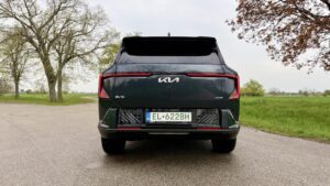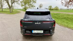 Zo zadnej časti tiež cítiť robustnosť, ktorú naznačoval už profil auta. EV5-ka vyzerá široko, stabilne a tak trochu „ťažkoobrneno“ – čo je vlastne fajn. Zadok dáva jasne najavo, že táto Kia neprišla hrať na jemné línie a mestskú eleganciu. Najmä v tejto šedej farbe a s paketom GT-Line pôsobí zadná časť dosť dospelo a hodnotne.